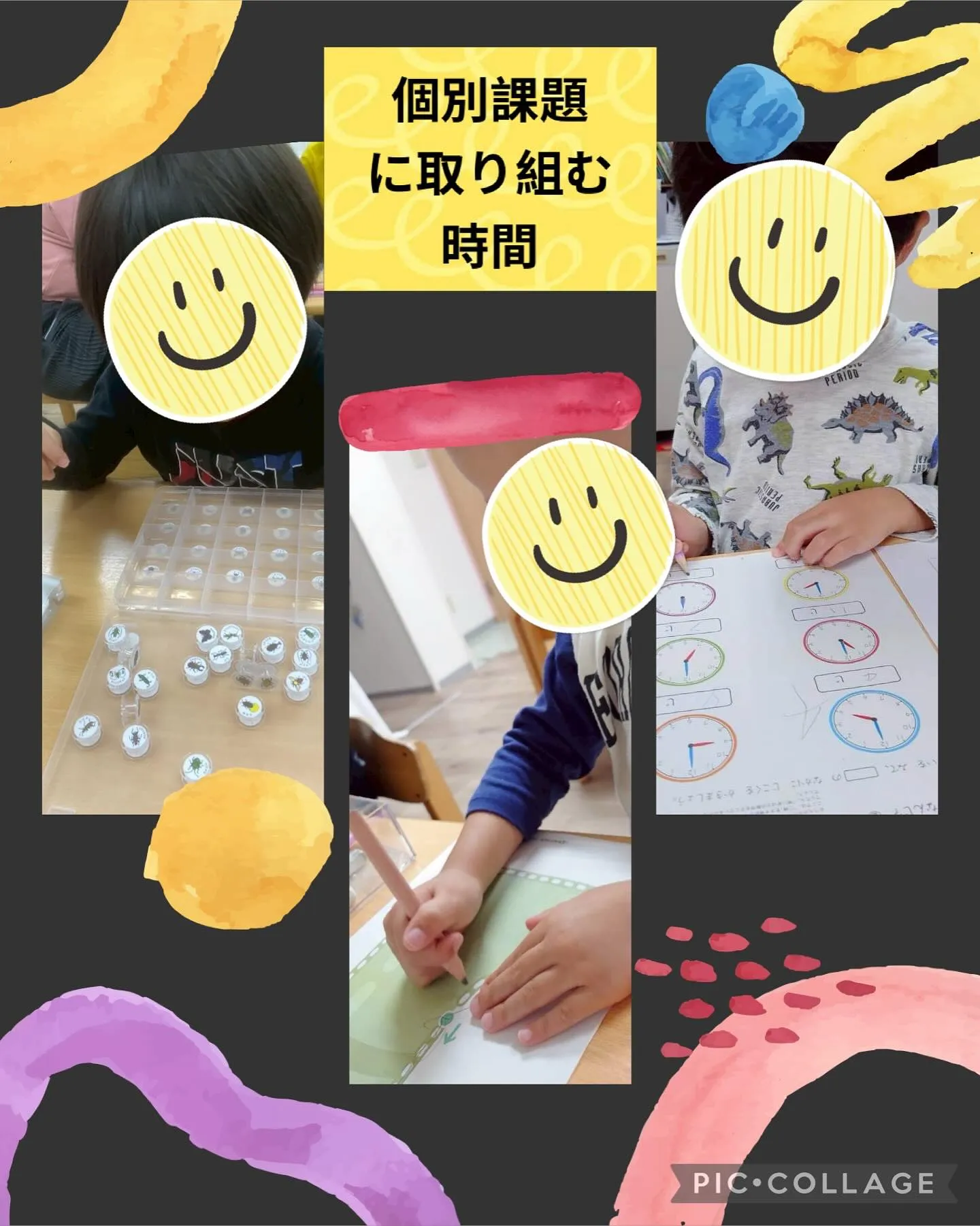 課題の内容は勿論、この時間は全員が椅子に座り机に向かっている為「椅子に座って集中する」を練習し、小学校生活へ向けて沢山のことを学べるよう支援する場になっています☀️
