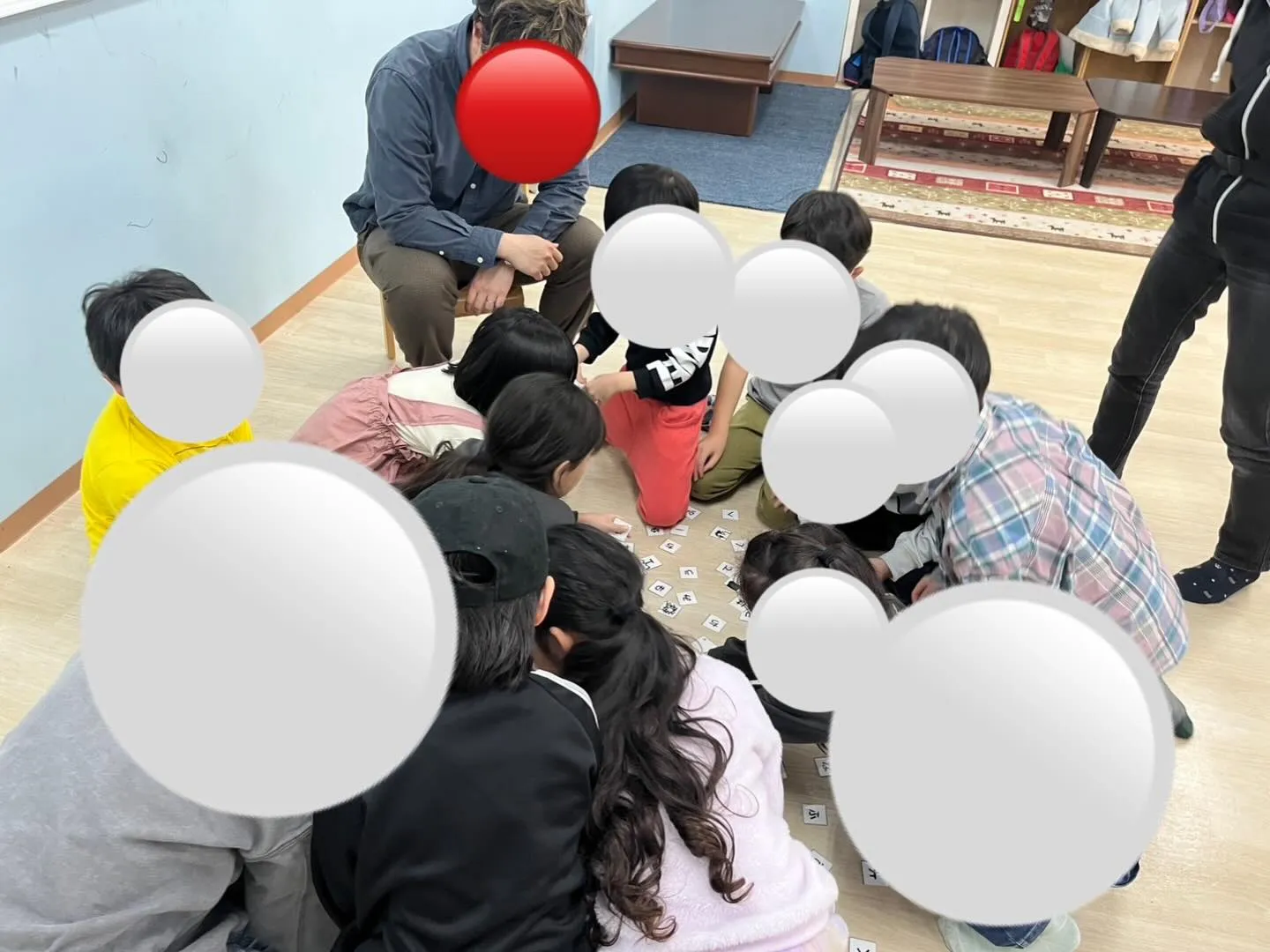 床に散らばしたひらがなカードを使って、お題通りの言葉を作るゲーム。